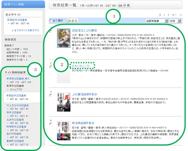 - 左部分には、サイト(検索対象)別の検索結果を表示しています。現在表示中の図書館を変更したい場合は、図書館名をクリックしてください。