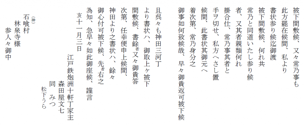 天保10年(1839)10月、石神村林泉寺の娘常野が江戸へ出たときの状況を伝える興味深い書状です。