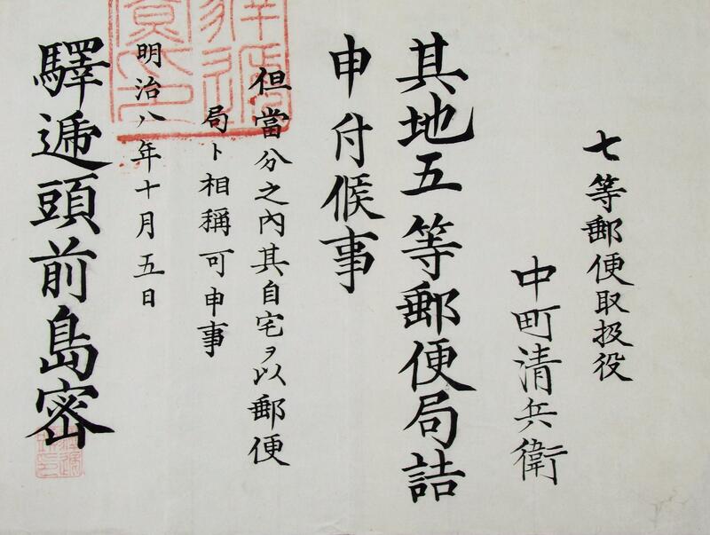 明治初頭の郵便取扱役の様子は、明治8年(1875)から19年(1886)に小千谷町の郵便取扱役を担った中町家の資料からうかがうことができます。駅逓頭(えきていがしら)前島密の名で中町清兵衛に宛てた郵便取扱役任命の辞令には、取扱人に任命する旨だけではなく「但(ただし)当分之内其自宅ヲ以郵便局ト相称可申事」とも書かれています。つまり、当分の間は自宅を郵便局と称するように命じられています。この頃の明治政府は財政が極めて窮迫(きゅうはく)しており新事業である郵便制度に回す資金がなく、全国に郵便局を設置することは困難でした。そこで、政府は地元の名士たちに官吏(かんり)(注)として郵便局で働く郵便取扱役の辞令を出します。郵便取扱役に任命された地元の名士たちは官吏としての格式と、わずかな手当を与えられる代わりに、郵便局として 土地や建物を無償で提供することになりました。明治初頭の郵便取扱役は取り扱う郵便の数も少なく、運営経費が手当を上回り、家業がなければ成り立たない役職でした。中町清兵衛が辞職願とともに添えた郵便取扱役の後任を推薦する上申書では「跡役之義ハ当小千谷町岩田善吉ハ平素執務上熱心ニシテ略御規則等モ熟読致シ居且品行方正ニシテ資産モ有之実ニ適当之人物ト被存候間何卒同人ヘ跡役被仰付下置度此段添テ奉上申候」とあり、平素から執務上熱心にして規則等も熟読し、品行方正で資産もある岩田善吉が次の役目にふさわしいと述べています。郵便取扱役を勤めるには仕事に熱心なだけでなく、運営費をまかなう資産をもっていることも条件のひとつでした。
