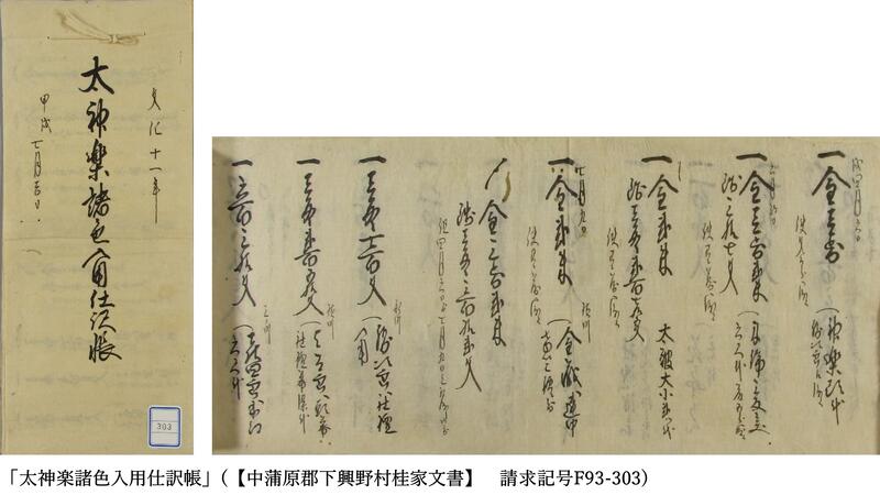 口伝・体得で継承され、時代とともに舞も変わる神楽は、文字として伝わることが稀で、往時の姿をうかがい知ることは容易ではありません。当館収蔵の中蒲原郡下興野村桂家文書「太神楽諸色仕訳帳」には、文化11年(1814)に奉加(寺社造立・修繕のための寄附金)を募るために太神楽を興行した費用が記されており、江戸時代の神楽を垣間見ることができます。